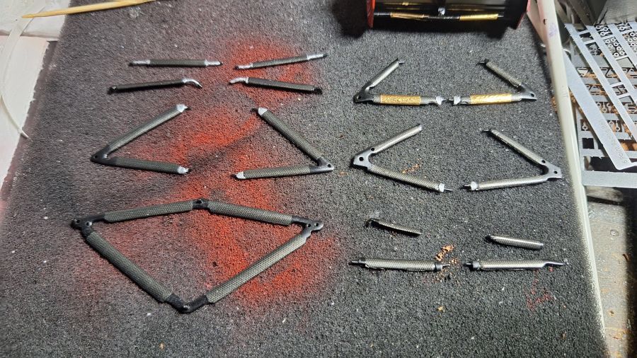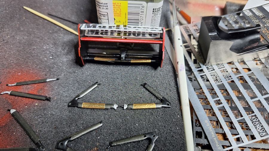 The parts of the suspension are painted black, then these will be covered with carbon decals.