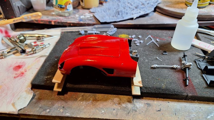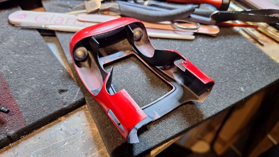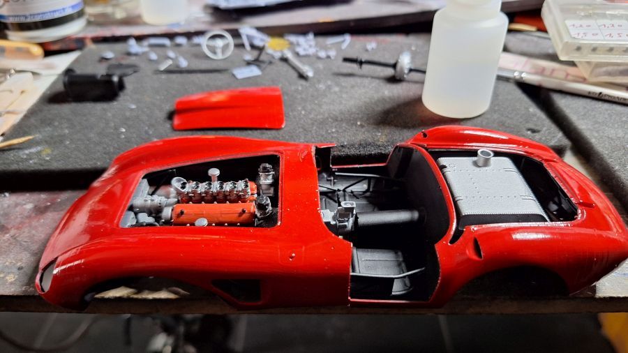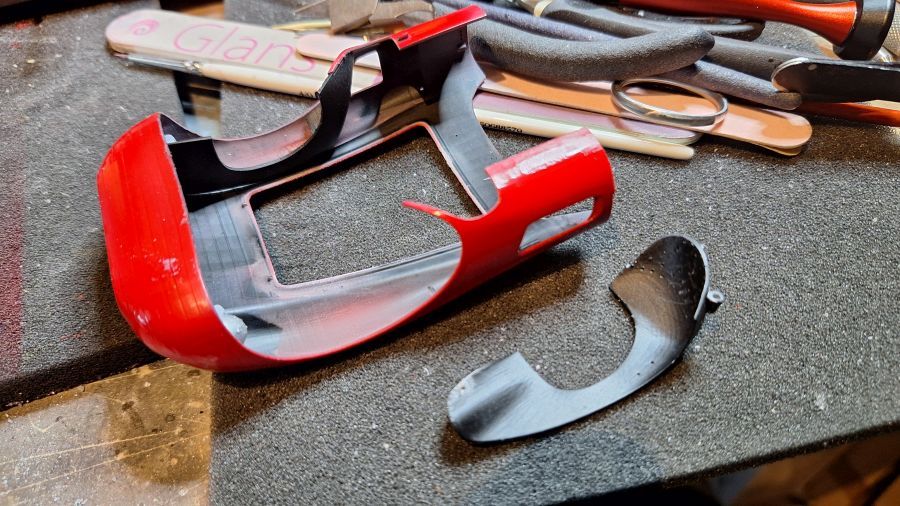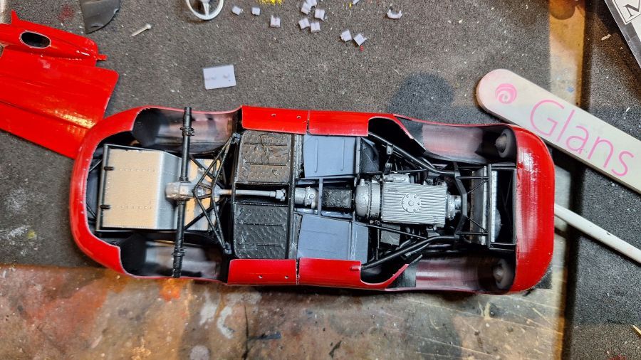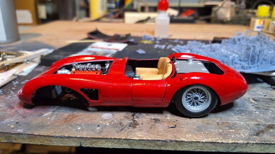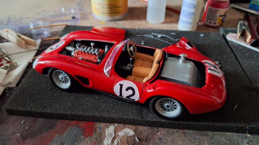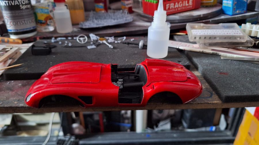 I came across this 3D printed kit of a 1956 Ferrari 625 TR (Test Rossa). This one was driven by Maurice Trintignant at the 24 Hrs of Le Mans. First of all cutting everything with my newly bought ultrasonic knife. It will take a while. Sometimes very tough to determine where to cut.