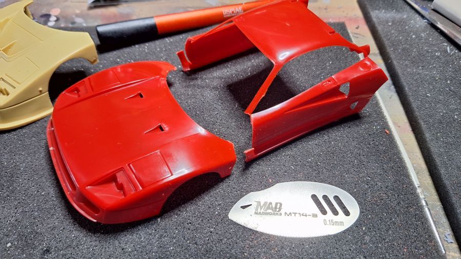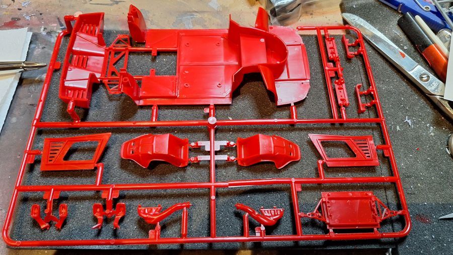 Ik vind het weer tijd voor een nieuwer type. Daarom deze Ferrari 488 GT3 EVO #74 zoals gereden door Felipe Fraga in de DTM klasse van 2022. De auto is van het team AF Corse Red Bull Alpha Tauri. Het is een kit van CGM. Voor mij tot nu toe een onbekend merk. We gaan het zien. Dit was een dure kit, vergelijkbaar met MFH, maar de kwaliteit valt me wat tegen. En voor dat geld geen etched, geen banden en een erg summier interieur. Dat wordt veel in de rommeldoos zoeken.