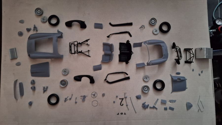 Ik kwam deze 3D geprinte kit van een 1956 Ferrari 625 TR (Testa Rossa) tegen. Deze werd bestuurd door Maurice Trintignant bij de 24 Uur van Le Mans. Eerst alles lossnijden met mijn nieuw aangeschafte ultrasonisch mes. Dat zal even duren. Soms erg lastig te bepalen waar je moet snijden.
