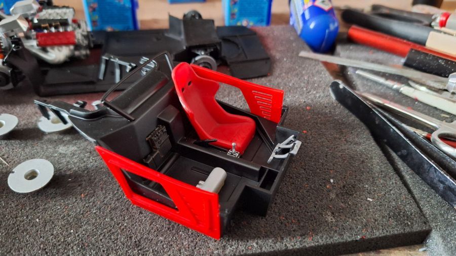 En weer naar de wielen... Ik heb 18 inch banden gekocht, maar deze zijn te smal op de velg. Ik ga nu banden gebruiken uit mijn Porsche 911 RSR kit. Daar heb ik inmiddels 3d geprinte velgen en banden voor. Ook deze passen niet perfect, maar ik doe het er mee.