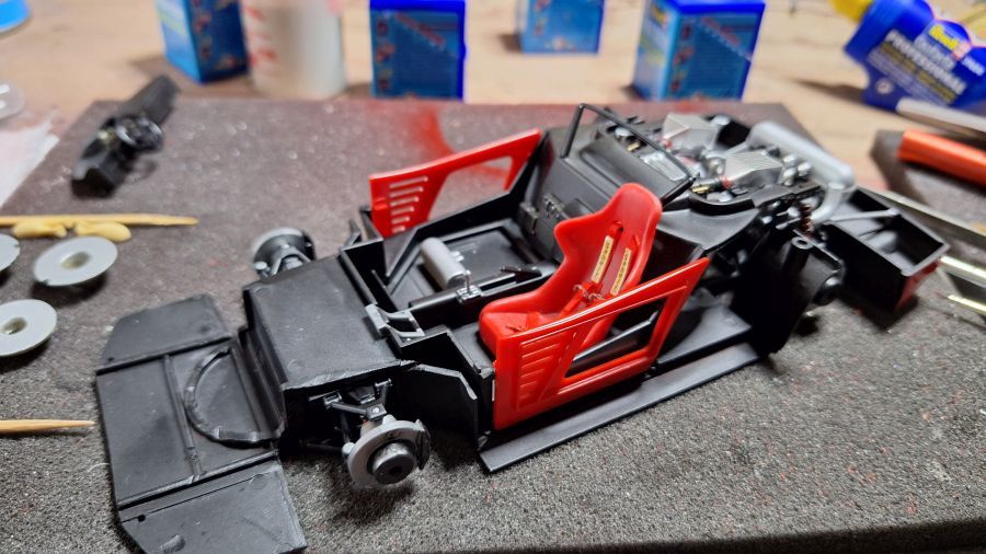 Adding the front spoiler, a part of the diffusor and the wheels.